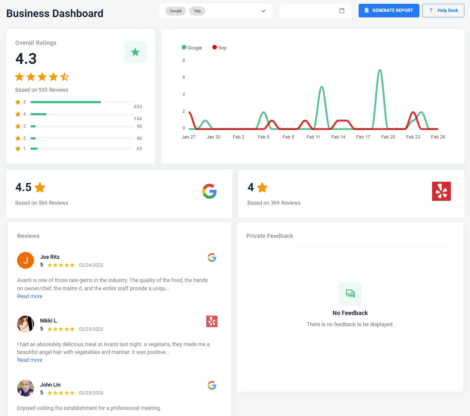 We help keep your business on top of its Yelp, Google and other review site rankings by filtering out negative reviews and post 4 or 5 star reviews straight to Google or your review site of your choice.