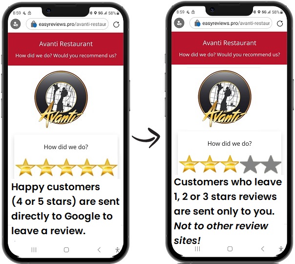 Is your custom review landing page. Where customers can leave you a review (1-5 stars) 4 and 5 stars go straight to Google or major reviews site of your choice, 1-3 stars go to your email inbox.